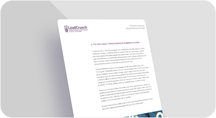 7 Data-Driven Reasons Why B2B Demand Gen Fails 2. THE DATA ABOUT THESE ENORMOUS NUMBERS IS FLAWED To deal with big numbers like the above, you need Big Data. Big Data helps you paint a mathematical picture of what your B2B environment looks like. Unfortunately, most of the widely available B2B data elements are deeply flawed. The three most prevalent data elements used to build B2B lead lists are industry codes, company headcount, and top line revenue. These three elements are flawed in not only the way they are designed and collected but also in the way that they are used. The top 3 US-based industry coding schemes are SIC codes, NAICS codes, and “home-grown” taxonomies, such as the one used by Linkedin. Each of these has serious design limitations. First and worst, the logic used to assign codes lacks rigor and consistency. Second, these coding schemes lack a reliable way to measure the relative similarity or difference between industry codes. Third, there are no incentives for companies to verify the accuracy of their own data and no central system within which to operate. Therefore, industry codes are frequently vague or simply incorrect. Headcount and revenue data suffer similar woes. First, category bins are created with arbitrary ranges that limit precision. Second, as we saw with industry codes, there is no system to verify data although the government does provide some degree of pressure to induce accuracy. Therefore, headcount and revenue outside of publicly traded companies are generally inaccurate or outdated. Despite these limitations, B2B companies still rely heavily, if not exclusively, on these three data elements to extract data for the top of their sales funnel. The three most prevalent data elements used to build B2B lead lists are: ● industry codes ● company headcount ● top line revenue These three elements are flawed in not only the way they are designed and collected but also in how they are used. www.leadcrunch.ai 4 www.leadcrunch.com