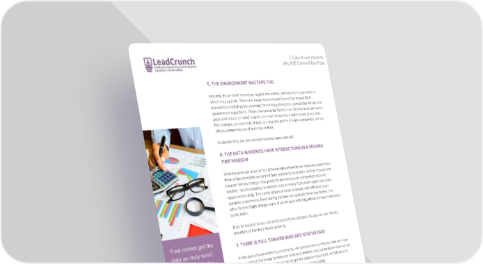 7 Data-Driven Reasons Why B2B Demand Gen Fails 5. THE ENVIRONMENT MATTERS TOO Not only do we need to analyze buyers and sellers, but also the environment in which they operate. There are many environmental forces that impact B2B transactions including the economy, technology disruptors, competitive forces, and government regulations. These environmental factors are not trivial and can have a profound impact on which buyers are most relevant to a seller at any given time. For example, an economic shock can raise the profile of some companies and put others companies out of business entirely. Understanding the environment requires more data still. 6. THE DATA ELEMENTS HAVE INTERACTIONS IN A MOVING TIME WINDOW Think for a minute about all the different data elements we have discussed. Now think of the incredible amount of data needed to track them as they change and interact. Sellers change, new products are introduced, competitors buy one another, new fiscal policy is enacted, and currency fluctuations open and close opportunities daily. The combinations of seller products with different buyer contacts is enormous. Even during the time we evaluate these two factors, five other factors might change, each of which have differing effects on buyer relevance to the seller. Data is required to see and understand these changes. As you can see, the our mountain of numbers keeps growing. If we cannot get the 7. THERE IS PULL TOWARD BIAS AND STATUS QUO data we truly need, In the face of overwhelming uncertainty, we humans tend to cling to what we know. we fall back on the If we cannot find a way to measure what truly matters, we just measure what we can data we have, whether it matters or not. If we cannot get the data we truly need, we fall back on the data we have, whether or not it accurately captures reality. whether or not it accurately captures In summary, there are vast seas of uncertainty created by the countless, unreliable, reality. ever-changing numbers that describe your markets. Sellers, sailing these high seas, are often tempted by the siren call of small islands of good data. Unfortunately, heading to these islands comes at a serious price—bias. Sure the data is good but what is missing from this data? Not surprisingly, most sellers have already docked on these islands instead of assembling their own high quality data. Therefore, the entire B2B seller market all lives on the same islands of biased data. What was true for ancient explorers is true for B2B sellers. If you want to discover great treasure, you have to go where others won’t go. Great explorers use the little data they have to sail their ships into uncharted territory where they create their own data. This data is hard won but it ends up yielding real treasure in today’s economy—proprietary data assets. www.leadcrunch.ai 6 www.leadcrunch.com
