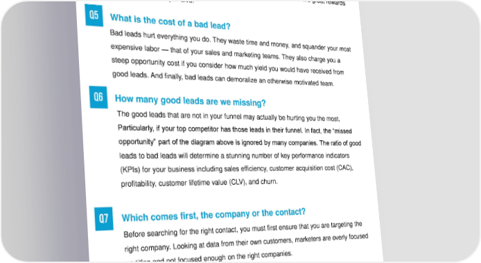 Lookalike marketing powered by artificial intelligence To build Holistic model, you need to first take a hard look at your current funnel process. Below are some questions you should ask, along with some instructive commentary. What is our primary performance metric for ToFu lead generation? Quality of Leads Where do you fall? Number of Leads If you fall closer to the “Quality” end of the spectrum go to Q2. If you fall closer to the “Number” end of the spectrum, go to Q5. How do you measure the quality of leads? What makes a lead good or bad? Is it strictly a property of the target account or is it also about the degree of “match” between you and the prospect? Is a closed sale the only true indicator of quality, or are there high quality accounts that you fail to close? Do you pursue the accounts you want, the accounts you think you can win, or the accounts that meet both criteria? If you look at data in all 3 categories, you’ll start to figure out how to prioritize accounts. How can you do a better job of defining target markets and personas? Here’s why you should not filter ToFu leads based on basic firmographics such as industry, size, and geography. Firmographic data is The firmographic view horribly inaccurate — of companies is very If everyone is using 40% of industry codes shallow. If you want to the same data then are wrong or incomplete know what a company everyone is while revenue values really does you must knocking on the are typically off by more look deeper. same doors. than 65%. LeadCrunchN. America HQ, 101 W. Broadway #200, San Diego, CA 92009 www.leadcrunch.ai ▪ 888-708-6649 ▪ sales@leadcrunch.ai