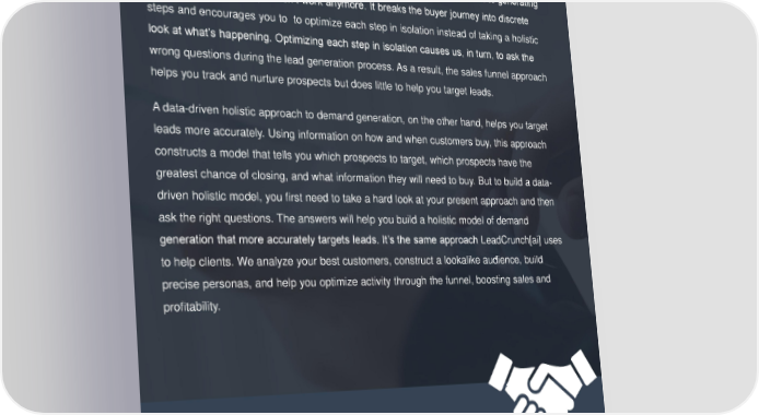 Lookalike marketing powered by artificial intelligence There are many data vendors. Most of them sell data sorted strictly on basic firmographics. Using deeper company insights to construct a target audience is more effective if you have the data to do so. And our data shows that there are great rewards from taking this deeper dive. What is the cost of a bad lead? Bad leads hurt everything you do. They waste time and money, and squander your most expensive labor — that of your sales and marketing teams. They also charge you a steep opportunity cost if you consider how much yield you would have received from good leads. And finally, bad leads can demoralize an otherwise motivated team. How many good leads are we missing? The good leads that are not in your funnel may actually be hurting you the most. Particularly, if your top competitor has those leads in their funnel. In fact, the “missed opportunity” part of the diagram above is ignored by many companies. The ratio of good leads to bad leads will determine a stunning number of key performance indicators (KPIs) for your business including sales efficiency, customer acquisition cost (CAC), profitability, customer lifetime value (CLV), and churn. Which comes first, the company or the contact? Before searching for the right contact, you must first ensure that you are targeting the right company. Looking at data from their own customers, marketers are overly focused on titles and not focused enough on the right companies. In practice, many accounts that are great leads are ignored because they lack the specific “required” contact data. Many bad leads are worked because they have the “required” contact data. Using contact data as a primary factor to define campaigns is a common mistake you must avoid to survive and thrive in the future.. LeadCrunchN. America HQ, 101 W. Broadway #200, San Diego, CA 92009 www.leadcrunch.ai ▪ 888-708-6649 ▪ sales@leadcrunch.ai