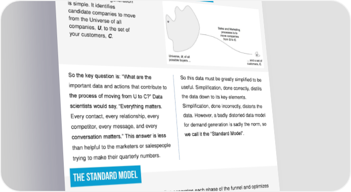 Lookalike marketing powered by artificial intelligence The B2B Sales Funnel is broken. We identify companies. We leave voicemails, send emails, generate InMails, and push ads. But most of these are deleted, spam filtered, ignored, or blocked. So then we try to use new marketing technologies to reach prospects. But despite the mind numbing number of sales and marketing technologies we use, we still can’t answer two thorny questions that plague our sales funnel: 1. How do you find the optimal audience to target? 2. How do you move this audience efficiently down the funnel? Platforms like Salesforce, Oracle, and Hubspot make it easier to track and nurture prospects but do little to help us target accurately. We throw huge dollars towards implementing these platforms, yet only improve things incrementally. So how can we better understand our customers and find ideal targets? We know which opportunities we win and lose. We capture massive amounts of data about our sales targets and our efforts to pursue them. Why isn’t all this data helping us to get better results? As you may have already experienced, it’s actually not easy to extract real value from this mountain of data. But based on everything we have read and after spending over three years looking at this problem, we have come to one unified answer to the problem: Since discovering this, we built a product to do exactly this. It analyzes your best customers, constructs a Data mine your best lookalike audience, builds precise personas, and helps customers to you optimize activity through the funnel. holistically optimize In this white paper, we’ll explain why the B2B sales your funnel. funnel is broken and how to fix it. We’ll share some frameworks we have developed that we hope will help you think about these issues in a deeper way. LeadCrunchN. America HQ, 101 W. Broadway #200, San Diego, CA 92009 www.leadcrunch.ai ▪ 888-708-6649 ▪ sales@leadcrunch.ai
